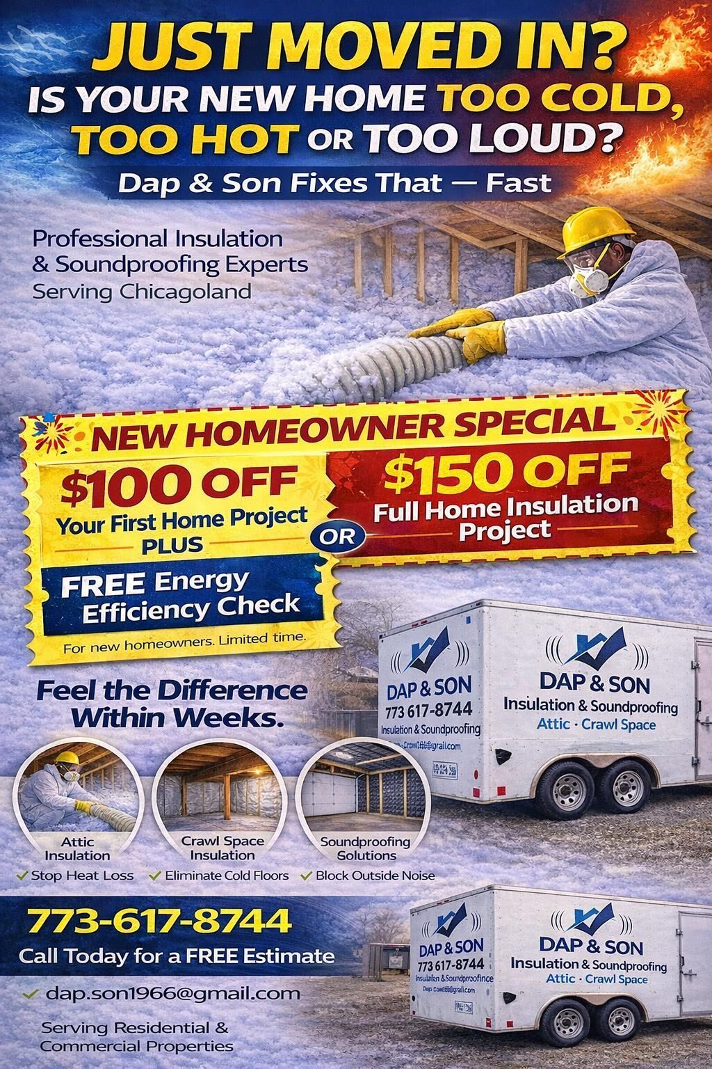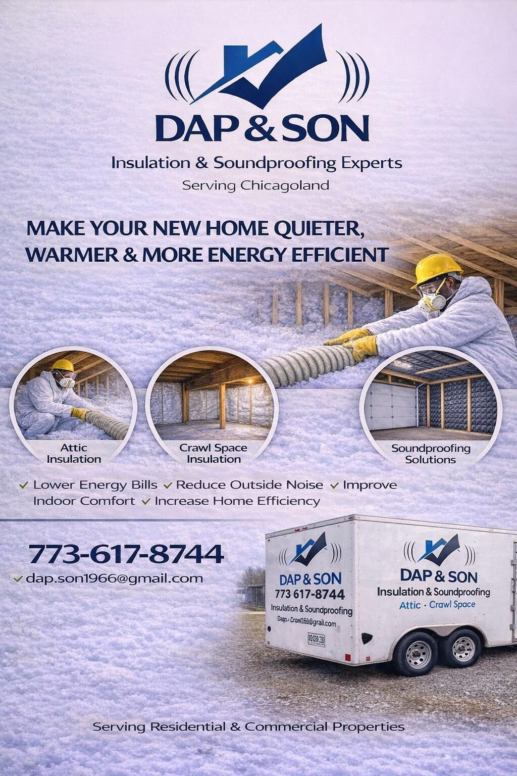 Welcome to DAP & Son Insulation and Soundproofing, your premier destination for top-quality insulation and soundproofing solutions in the greater Chicago area. With over two decades of expertise, we're thrilled to offer our unmatched services to homeowners and property owners alike. At DAP & Son Insulation and Soundproofing, we prioritize your comfort, energy efficiency, and peace of mind, ensuring that every project is executed with precision and care. Whether you're looking to enhance your home's insulation, minimize noise disturbances, or both, our dedicated team is here to exceed your expectations.